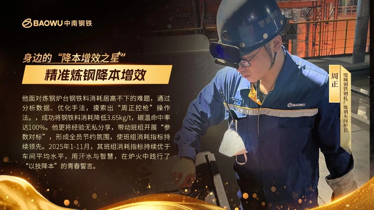針對煉鋼過程中容易出現的原料浪費問題,周正帶頭琢磨改進方案,帶著大家優化加料節奏。在他的帶動下,班組形成了“人人算成本、班班講節約”的氛圍。2025年1-11月,他所在班組的鋼鐵料消耗指標持續低於車間平均水平,用實打實的成績,讓降本增效的種子在爐台落地生根、開花結果。
