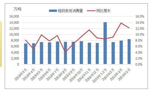 統計局、海關總署數據顯示,2019年5月全國粗鋼產量8909.1萬噸,鋼材淨出口476萬噸,鋼坯及粗鍛件淨進口11萬噸,折合粗鋼表觀消費量8424萬噸(鋼材按0.96折算),同比增長12.2%。(注:2018年5月全國粗鋼產量修正為8099.2萬噸,粗鋼表觀消費量修正為7511萬噸)