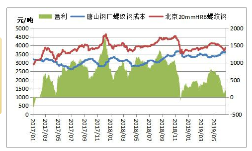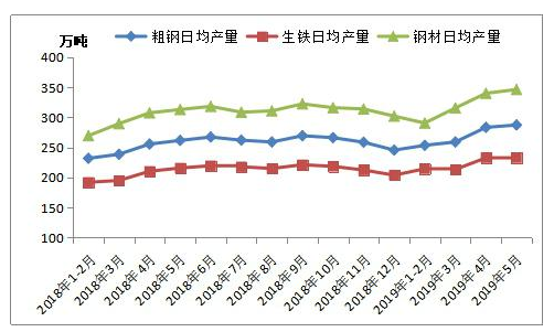 2019年5月,全國粗鋼日均產量287.39萬噸,較上月增長1.4%,再創曆史新高。盡管5月份鋼材市場震蕩下行,行業利潤出現收縮,但整體盈利尚可,鋼廠生產積極性仍高。