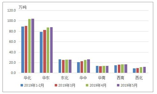 按地區來看,2019年1-5月,華北地區粗鋼產量1.45億噸,同比增長14.7%;華東地區粗鋼產量1.27億噸,同比增長5.8%;東北地區粗鋼產量3890萬噸,同比增長9.3%;華中地區粗鋼產量3494萬噸,同比增長6.3%;西南地區粗鋼產量2450萬噸,同比增長14.5%;華南地區粗鋼產量1987萬噸,同比下降3.6%;西北地區粗鋼產量1535萬噸,同比增長13.3%。