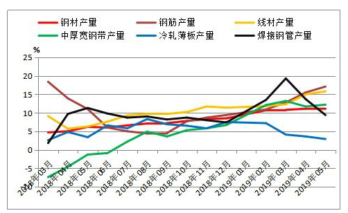 按鋼材品種來看,2019年1-5月我國鋼材產量4.80億噸,同比增長11.2%。其中,鋼筋產量9574.3萬噸,同比增長17.1%;線材產量6299.9萬噸,同比增長15.8%;冷軋薄板產量1306萬噸,同比增長2.9%;中厚寬鋼帶產量6297.6萬噸,同比增長12.2%;焊接鋼管產量2035.2萬噸,同比增長9.4%。