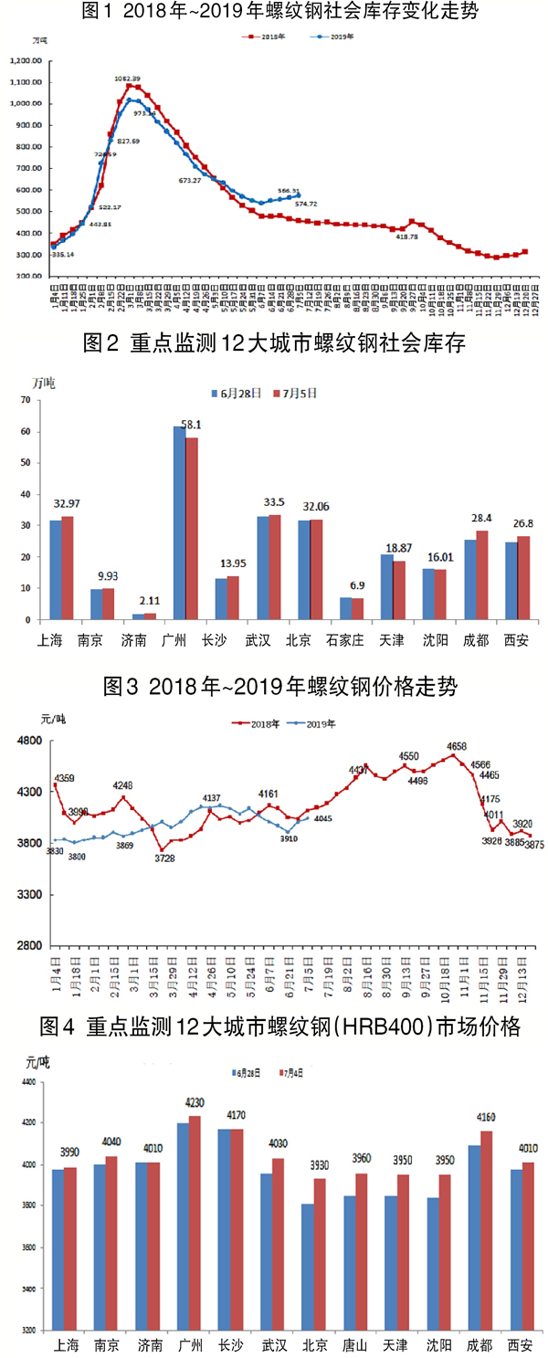 7月1日~7月5日,螺紋鋼社會庫存為574.72萬噸,環比上升8.41萬噸,升幅為1.46%。重點監測的12個城市庫存升降不一,其中廣州、天津下降較大,成都、西安上升較大。