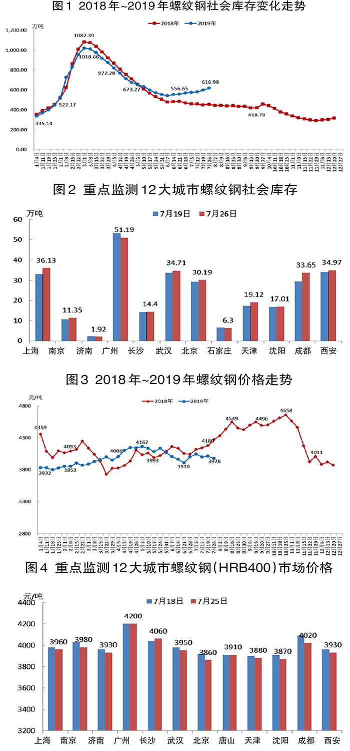 7月22日~7月26日,螺紋鋼社會庫存為616.98萬噸,環比上升20.76萬噸,升幅為3.48%。重點監測的12個城市螺紋鋼庫存升降不一,其中廣州降幅較大,成都、上海升幅較大。