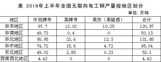 據中國金屬學會電工鋼分會數據,2019年上半年,我國共生產無取向電工鋼454.5萬噸,同比增長0.61%。其中,中低牌號無取向電工鋼產量為371.54萬噸,同比增長1.53%;高牌號無取向電工鋼產量為55.47萬噸,同比下降3.29%;高效(高磁感)無取向電工鋼產量為27.5萬噸,同比下降3.41%。今年上半年,無取向電工鋼市場產銷情況具體如何?後期需求走勢如何?本文帶您一窺究竟。