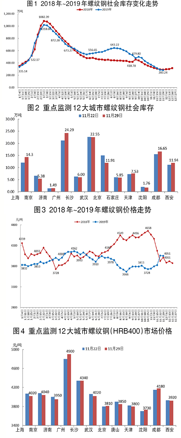 11月25日~11月29日,螺紋鋼社會庫存為283.24萬噸,環比下降3.84萬噸,降幅為1.34%。重點監測的12個城市庫存升降不一,其中北京、南京等城市庫存降幅較大,廣州、上海等城市庫存升幅較大。
