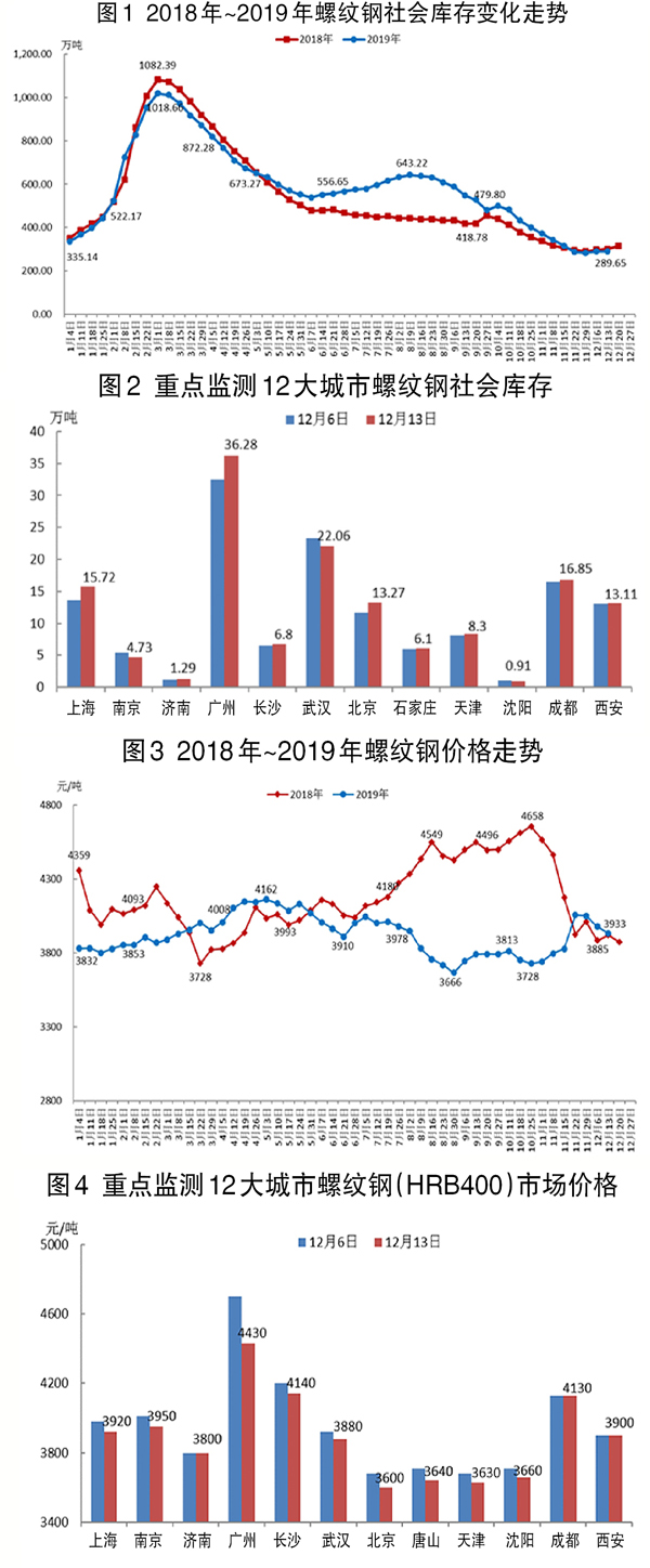 12月9日~12月13日,螺紋鋼社會庫存為289.65萬噸,環比上升0.84萬噸,升幅為0.29%。重點監測的12個城市庫存升降不一,其中武漢、南京等城市降幅較大,廣州、上海等城市升幅較大。