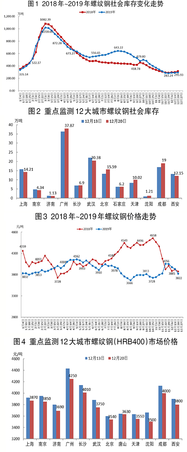 12月16日~12月20日,螺紋鋼社會庫存為295.93萬噸,環比上升6.28萬噸,升幅為2.17%。重點監測的12個城市庫存跌漲互現,其中武漢、上海等城市降幅較大,北京、成都等城市升幅較大。