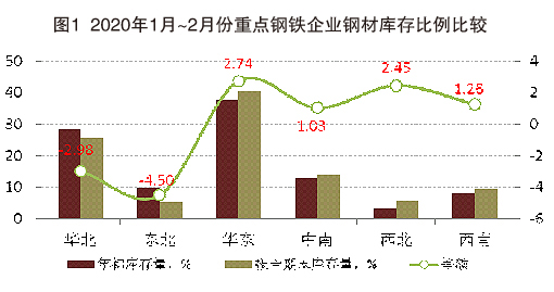 2月末,華北和東北地區鋼材庫存量占重點鋼鐵企業庫存量的比例,低於年初庫存量占重點鋼鐵企業庫存量的比例,分別減少了2.98、4.50個分點;華東、中南、西北和西南地區鋼材庫存量占重點鋼鐵企業庫存量的比例,高於年初庫存量占重點鋼鐵企業庫存量的比例,分別提高了2.74個、1.03個、2.45個和1.26個百分點。
