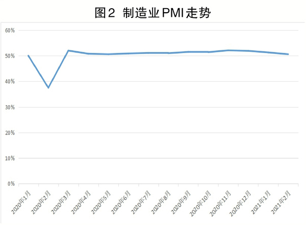最新公布數據顯示,2月份中國製造業PMI(采購經理指數)達50.6%,低於1月份0.7個百分點,連續12個月位於臨界點(50%)以上(見圖2)。筆者預計,2021年我國製造業PMI將持續位於榮枯線以上,預計2021年消費和製造業投資同比均增長10%左右。