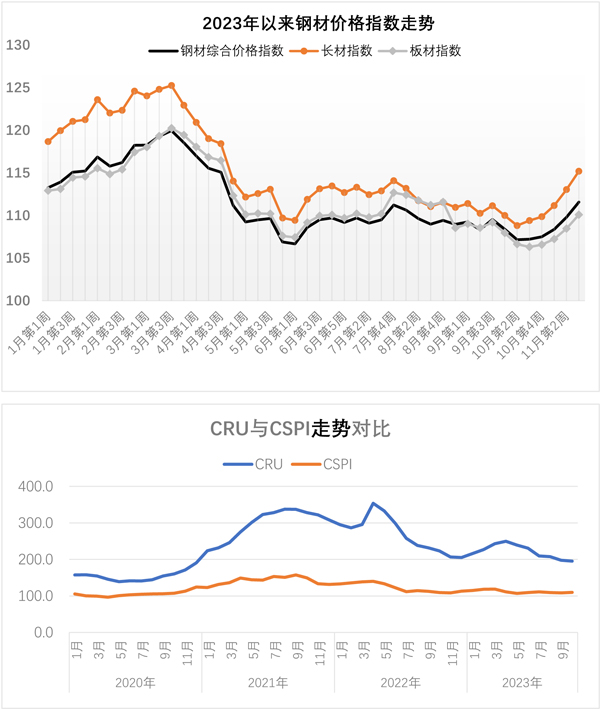 11月13日—11月17日當周,國內鋼材價格指數繼續上漲,長材、板材價格指數均有所上漲。10月末以來,鋼材價格已連續3周上漲。