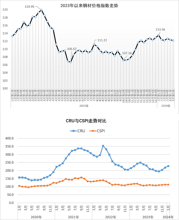 從國際市場來看,2024年1月份,CRU國際鋼材價格指數為227.9點,環比上漲9.2點,漲幅為4.2%,環比連續3個月回升;比去年底上漲9.2點,漲幅為4.2%;同比上漲11.9點,漲幅為5.5%。其中,CRU長材價格指數為218.8點,環比上漲5.0點,漲幅為2.3%;同比下降21.1點,降幅為8.8%。CRU板材價格指數為232.2點,環比上漲11.1點,漲幅為5.0%;同比上漲28.1點,漲幅為13.8%。分地區來看,2024年1月份,北美地區價格指數為289.6點,環比上漲19.3點,漲幅為7.1%;歐洲地區價格指數為236.6點,環比上漲7.7點,漲幅為3.4%;亞洲地區價格指數為186.9點,環比上漲4.2點,漲幅為2.3%。