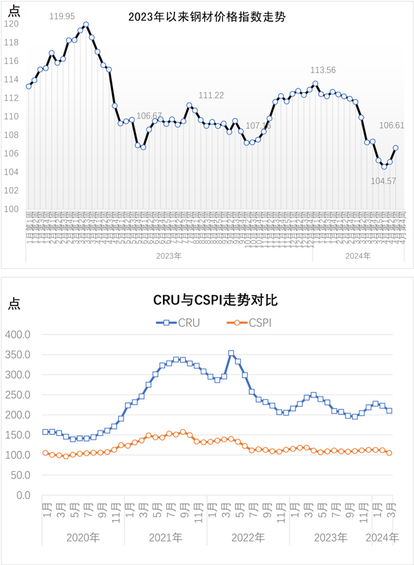 當周,中國鋼材價格指數(CSPI)為106.61點,周環比增加1.51點,增幅為1.44%;比上月末上漲1.34點,漲幅為1.27%;比去年底下降6.29點,降幅為5.57%;同比下降8.46點,降幅為7.35%。其中,長材價格指數為109.11點,周環比增加2.62點,增幅為2.46%;比上月末上漲3.07點,漲幅為2.90%;比去年底下降7.00點,降幅為6.03%;同比下降9.31點,降幅為7.86%。板材價格指數為104.88點,周環比增加0.91點,增幅為0.88%;比上月末上漲0.37點,漲幅為0.35%;比去年底下降6.92點,降幅為6.19%;同比下降11.57點,降幅為9.94%。