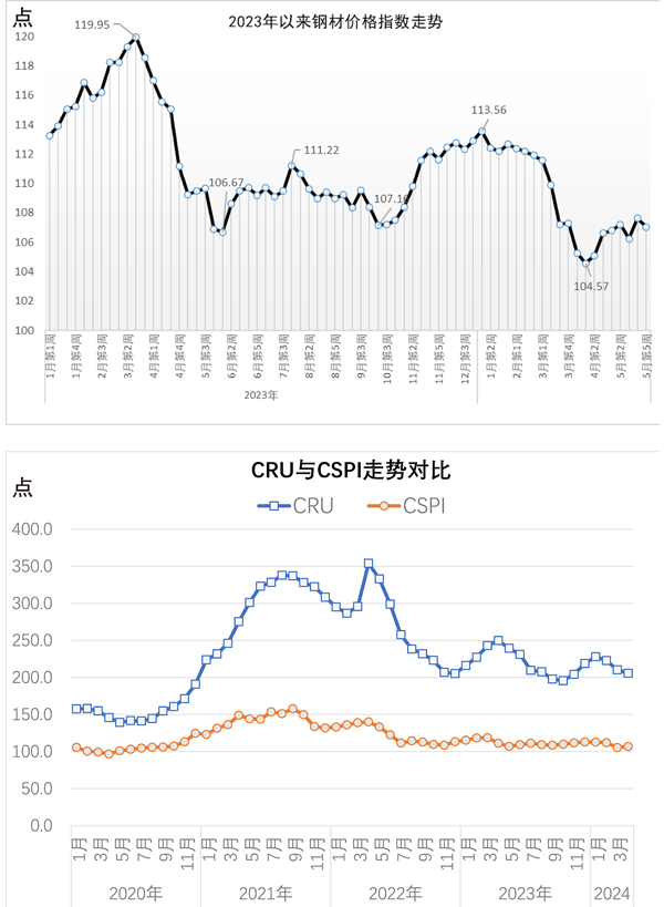 當周,中國鋼材價格指數(CSPI)為107.03點,周環比下降0.59點,降幅為0.55%;比上月末上漲0.25點,漲幅為0.23%;比去年底下降5.87點,降幅為5.20%;同比上漲0.14點,漲幅為0.13%。其中,長材價格指數為110.91點,周環比下降0.63點,降幅為0.57%;比上月末上漲1.51點,漲幅為1.38%;比去年底下降5.20點,降幅為4.48%;同比上漲1.21點,漲幅為1.10%。板材價格指數為104.51點,周環比下降0.60點,降幅為0.57%;比上月末下降0.47點,降幅為0.45%;比去年底下降7.29點,降幅為6.52%;同比下降3.09點,降幅為2.87%。