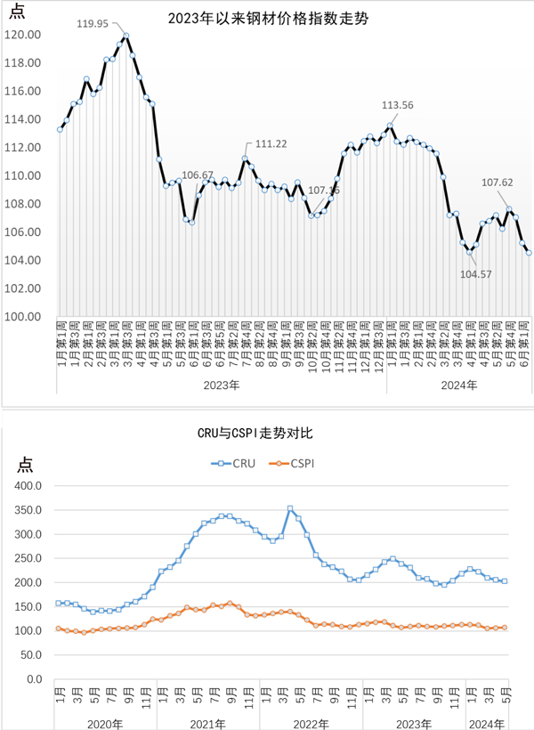 當周,中國鋼材價格指數(CSPI)為104.23點,周環比下降0.29點,降幅為0.28%;比上月末下降2.80點,降幅為2.62%;比去年底下降8.67點,降幅為7.68%;同比下降5.28點,降幅為4.82%。其中,長材價格指數為106.92點,周環比下降0.28點,降幅為0.26%;比上月末下降3.99點,降幅為3.60%;比去年底下降9.19點,降幅為7.91%;同比下降6.21點,降幅為5.49%。板材價格指數為102.31點,周環比下降0.29點,降幅為0.28%;比上月末下降2.20點,降幅為2.11%;比去年底下降9.49點,降幅為8.49%;同比下降7.65點,降幅為6.96%。