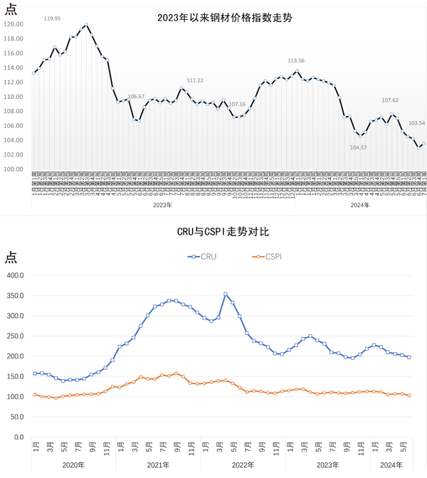 當周,中國鋼材價格指數(CSPI)為103.54點,周環比上漲0.58點,漲幅為0.56%;比上月末上漲0.58點,漲幅為0.56%;比去年底下降9.36點,降幅為8.29%;同比下降6.16點,降幅為5.62%。其中,長材價格指數為105.96點,周環比上漲0.76點,漲幅為0.72%;比上月末上漲0.76點,漲幅為0.72%;比去年底下降10.15點,降幅為8.74%;同比下降7.35點,降幅為6.49%。板材價格指數為101.82點,周環比上漲0.52點,漲幅為0.51%;比上月末上漲0.52點,漲幅為0.51%;比去年底下降9.98點,降幅為8.93%;同比下降8.39點,降幅為7.61%。