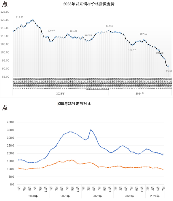 當周,中國鋼材價格指數(CSPI)為91.68點,周環比上漲0.30點,漲幅為0.33%;比上月末下降5.32點,降幅為5.48%;比去年底下降21.22點,降幅為18.80%;同比下降17.70點,降幅為16.18%。其中,長材價格指數為94.73點,周環比上漲1.15點,漲幅為1.23%;比上月末下降3.62點,降幅為3.68%;比去年底下降21.38點,降幅為18.41%;同比下降16.82點,降幅為15.08%。板材價格指數為88.86點,周環比下降0.12點,降幅為0.13%;比上月末下降6.71點,降幅為7.02%;比去年底下降22.94點,降幅為20.52%;同比下降22.72點,降幅為20.36%。