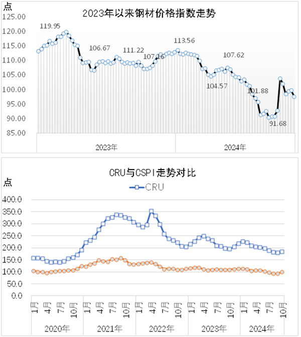 從國際市場來看,10月份,CRU國際鋼材價格指數為184.5點,環比上漲3.5點,漲幅為1.9%;比去年底下降34.2點,降幅為15.6%;同比下降11.0點,降幅為5.6%。其中,CRU長材價格指數為201.1點,環比上漲4.4點,漲幅為2.2%;比去年底下降12.7點,降幅為5.9%;同比下降7.7點,降幅為3.7%。CRU板材價格指數為176.2點,環比上漲3.1點,漲幅為1.8%;比去年底下降44.9點,降幅為20.3%;同比下降12.8點,降幅為6.8%。分地區來看,10月份,北美地區鋼材價格指數為208.3點,與9月份持平,同比下降3.0點,降幅為1.4%;歐洲地區鋼材價格指數為199.4點,比9月份下降11.3點,降幅為5.4%,同比下降15.1點,降幅為7.0%;亞洲地區鋼材價格指數為162.2點,環比上漲13.8點,漲幅為9.3%,同比下降13.6點,降幅為7.7%。