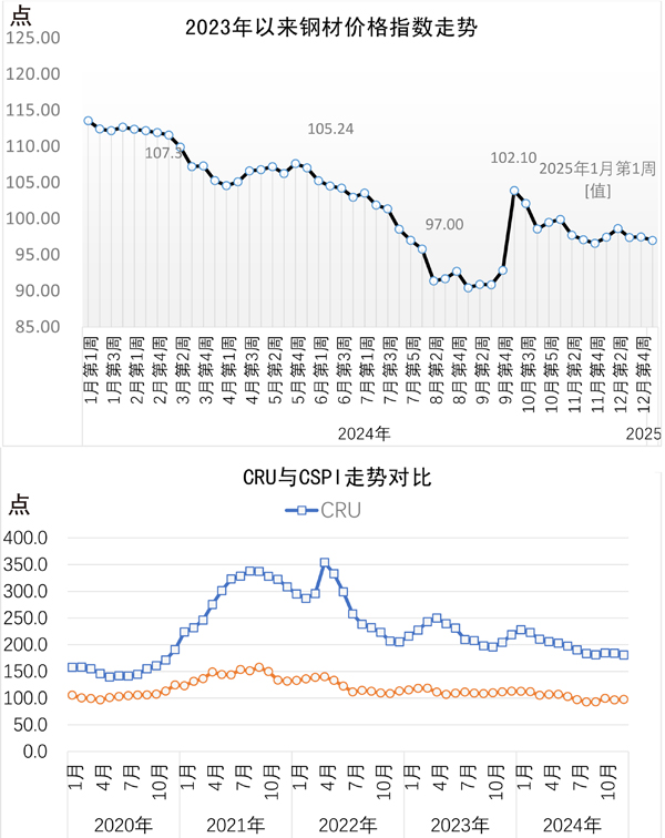2024年12月30日—2025年1月3日當周,國內鋼材價格指數環比小幅下降。長材價格指數、板材價格指數均小幅下降,長材價格指數降幅小於板材價格指數降幅。