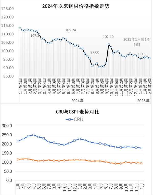 從國際市場來看,2025年1月份,CRU國際鋼材價格指數為178.3點,環比下降2.3點,降幅為1.3%;同比下降49.6點,降幅為21.8%。其中,CRU長材價格指數為194.9點,環比下降1.3點,降幅為0.7%;同比下降23.9點,降幅為10.9%。CRU板材價格指數為170點,環比下降2.8點,降幅為1.6%;同比下降62.2點,降幅為26.8%。分地區來看,2025年1月份,北美地區鋼材價格指數為203.6點,環比上漲0.6點,漲幅為0.3%,同比下降86.0點,降幅為29.7%;歐洲地區鋼材價格指數為201.5點,環比下降0.2點,降幅為0.1%,同比下降35.1點,降幅為14.8%;亞洲地區鋼材價格指數為150.5點,環比下降5.2點,降幅為3.3%,同比下降36.4點,降幅為19.5%。