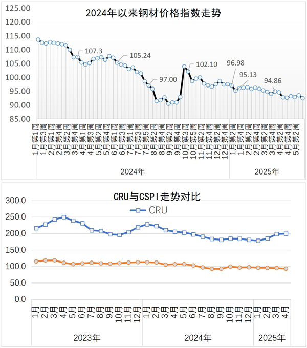 當周,中國鋼材價格指數(CSPI)為92.40點,周環比下降1.05點,降幅為1.12%;比上月末下降0.76點,降幅為0.82%;比去年底下降5.07點,降幅為5.20%;同比下降15.22點,降幅為14.14%。其中,長材價格指數為94.36點,周環比下降1.31點,降幅為1.37%;比上月末下降0.73點,降幅為0.77%;比去年底下降5.86點,降幅為5.85%;同比下降17.18點,降幅為15.40%。板材價格指數為90.62點,周環比下降0.97點,降幅為1.06%;比上月末下降0.83點,降幅為0.91%;比去年底下降4.93點,降幅為5.16%;同比下降14.49點,降幅為13.79%。