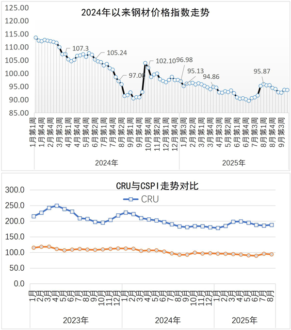 9月22日—26日,國內鋼材價格指數環比略有下降。當周,中國鋼材價格指數(CSPI)為93.63點,周環比下降0.06點,降幅為0.06%;比上月末下降0.39點,降幅為0.41%;比去年底下降3.84點,降幅為3.94%;同比上漲0.78點,漲幅為0.84%。其中,長材價格指數為94.16點,周環比上漲0.18點,漲幅為0.19%;比上月末下降0.97點,降幅為1.02%;比去年底下降6.06點,降幅為6.05%;同比下降3.61點,降幅為3.69%。板材價格指數為92.83點,周環比下降0.19點,降幅為0.20%;比上月末下降0.06點,降幅為0.06%;比去年底下降2.72點,降幅為2.85%;同比上漲3.48點,漲幅為3.89%。