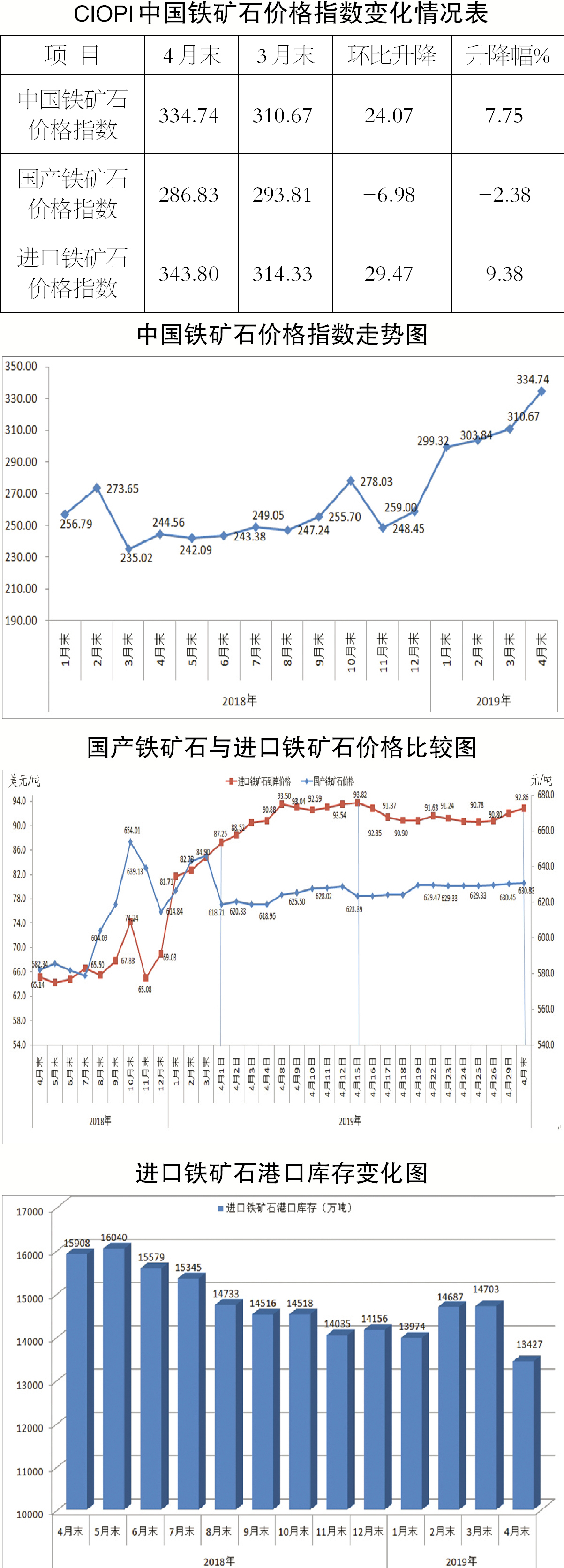 據中國鋼鐵工業協會監測,4月末,中國鐵礦石價格指數(CIOPI)為334.74點,環比上升24.07點,升幅為7.75%。其中,國產鐵礦石價格指數為286.83點,環比下降6.98點,降幅為2.38%;進口鐵礦石價格指數為343.80點,環比上升29.47點,升幅為9.38%。