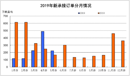 2019年1~5月yue份fen,國guo際ji航hang運yun市shi場chang探tan底di小xiao幅fu回hui升sheng,全quan球qiu新xin船chuan訂ding單dan量liang同tong比bi繼ji續xu下xia降jiang。我wo國guo造zao船chuan完wan工gong量liang保bao持chi增zeng長chang,但dan新xin承cheng接jie訂ding單dan量liang和he手shou持chi船chuan舶bo訂ding單dan同tong比bi繼ji續xu下xia降jiang。重zhong點dian監jian測ce企qi業ye工gong業ye總zong產chan值zhi等deng主zhu要yao經jing濟ji指zhi標biao止zhi跌die回hui升sheng。