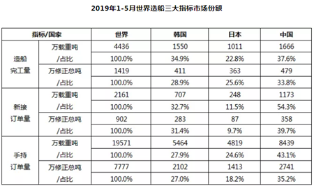 1~5月,我國造船完工量、新接訂單量、手持訂單量分別占世界市場份額的37.6%、54.3%和43.1%。