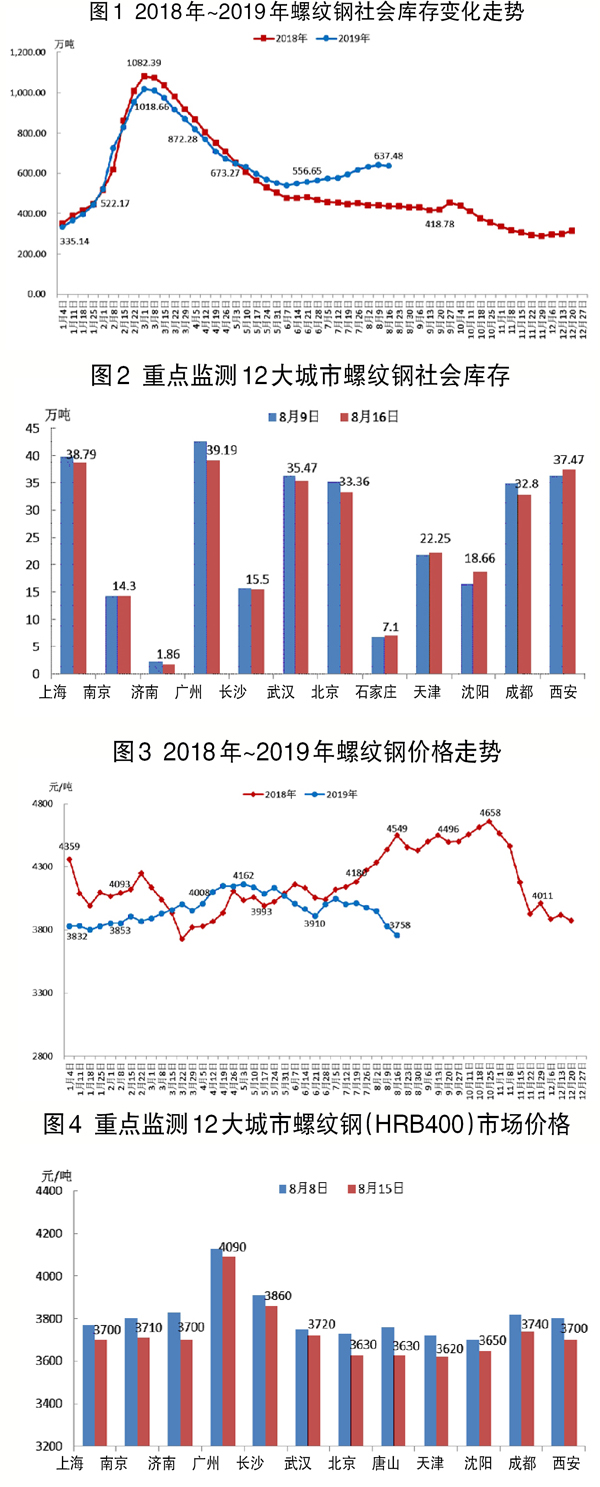 8月12日~8月16日,螺紋鋼社會庫存為637.48萬噸,環比下降5.74萬噸,降幅為0.89%。重點監測的12個城市庫存漲跌互現,其中廣州、北京、成都等城市庫存下降較大,沈陽庫存上升較大。