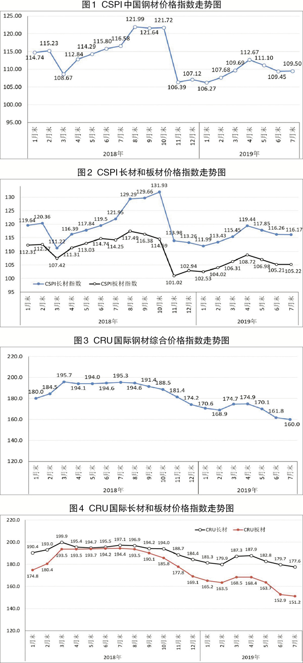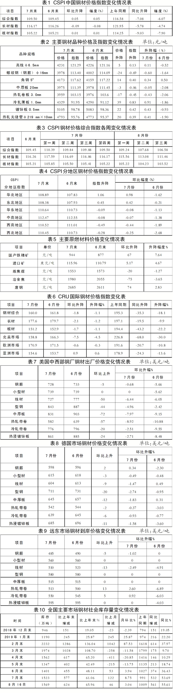 7月末,鋼協CSPI中國鋼材價格指數為109.50點,環比上升0.05點,升幅為0.05%,環比由降轉升;同比下降7.08點,降幅為6.07%。(見圖1)
