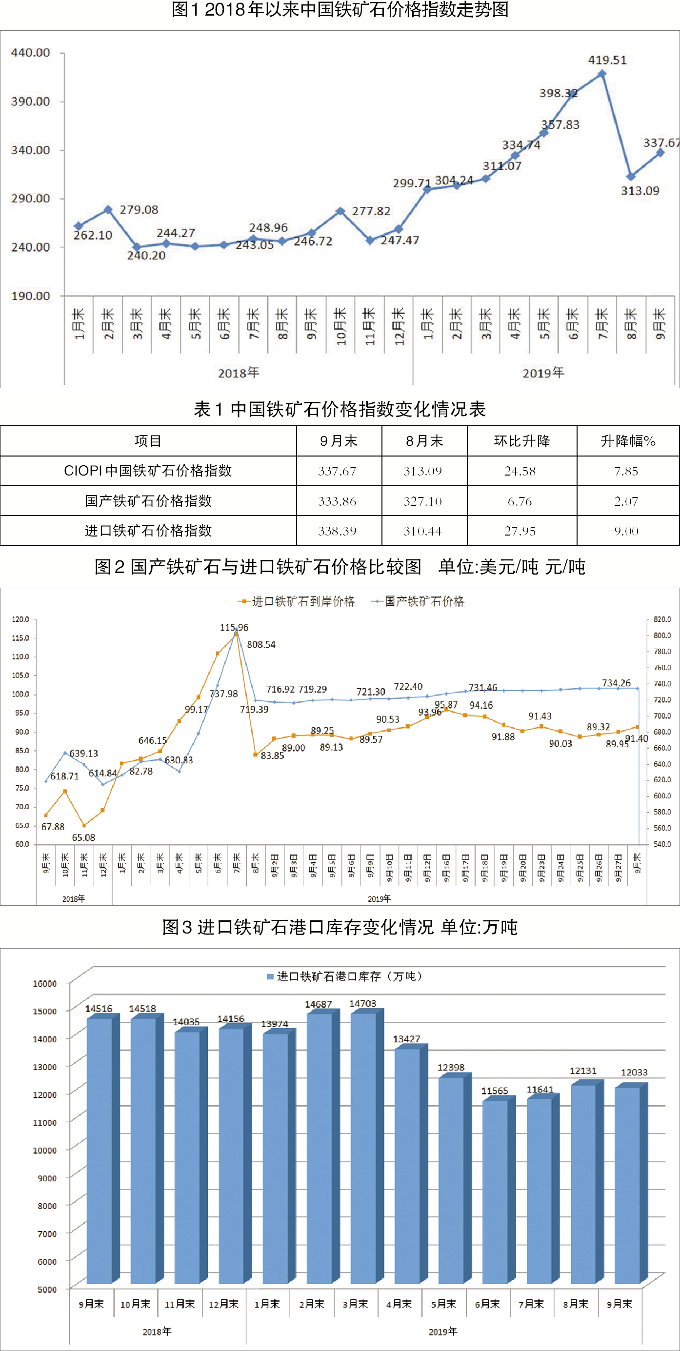 據中國鋼鐵工業協會監測,9月末,中國鐵礦石價格指數(CIOPI)為337.67點,環比上升24.58點,升幅為7.85%,環比由降轉升。其中,國產鐵礦石價格指數為333.86點,環比上升6.76點,升幅為2.07%;進口鐵礦石價格指數為338.39點,環比上升27.95點,升幅為9.00%。