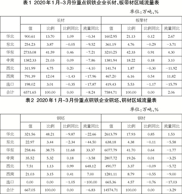1月~3月份,重點鋼鐵企業鋼材流量按區域占比大小排序依次是:華東、中南、華北、西南、東北、出口、西北。同2019年1月~3月份相比,華東地區鋼材流量占比提高最大,提高了0.93個百分點;出口鋼材流量占比下降最大,下降了1.16個百分點。鋼材流量同2019年1月~3月份相比,出口降幅最大,下降25.97%。