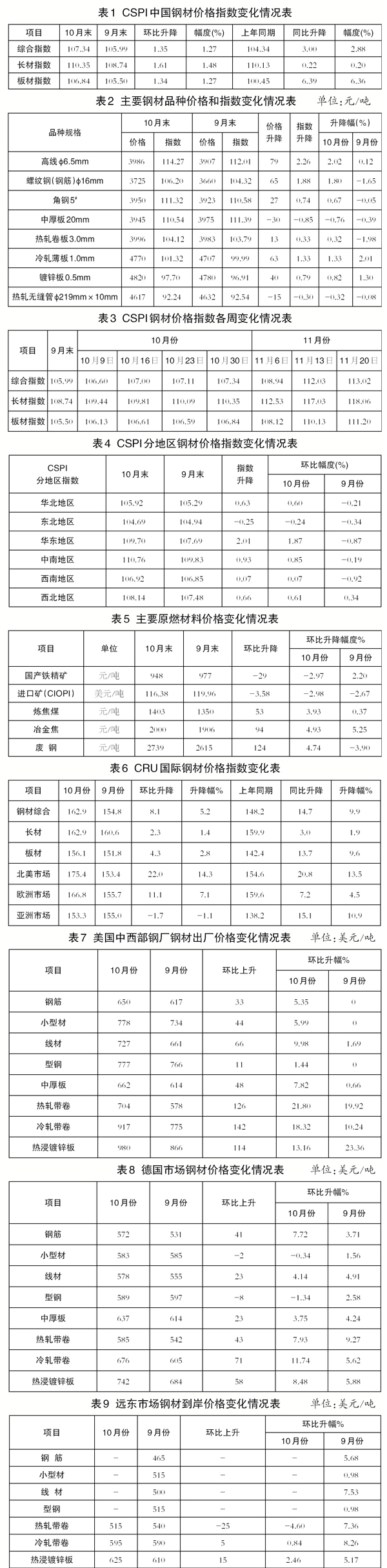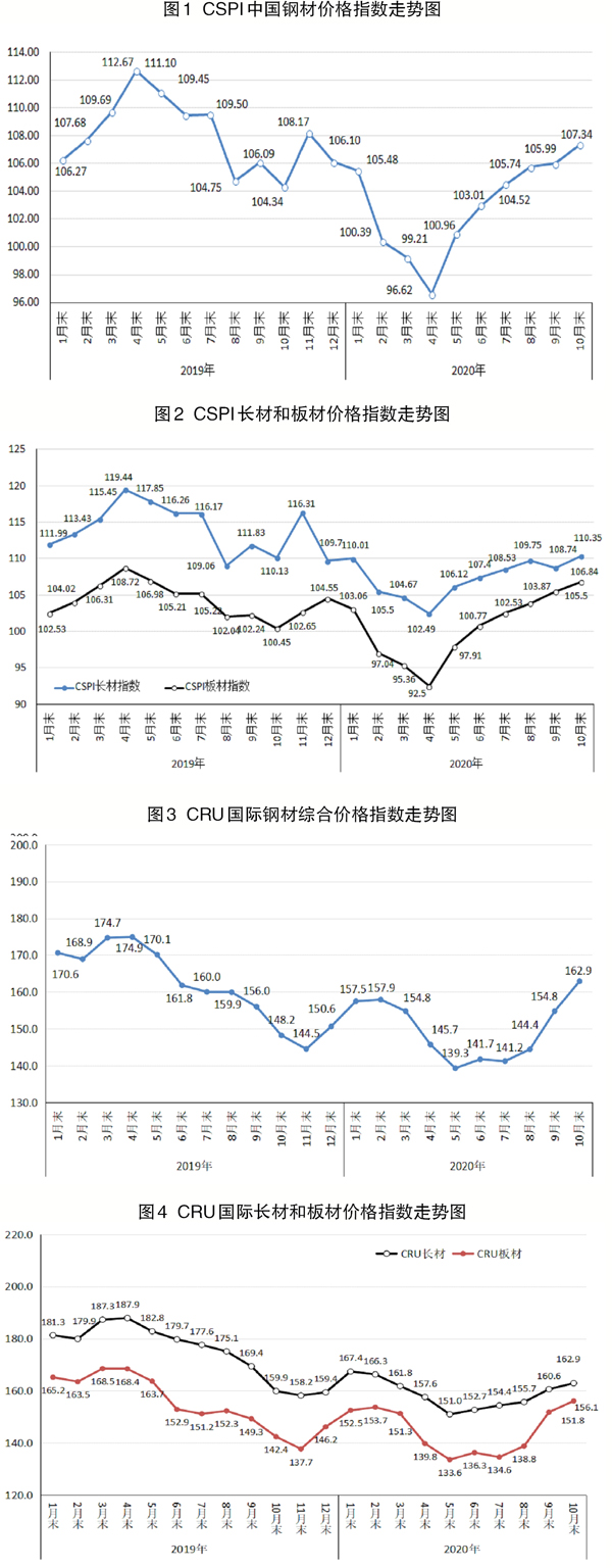 10月末,CSPI長材指數為110.35點,環比上升1.61點,升幅為1.48%;CSPI板材指數為106.84點,環比上升1.34點,升幅為1.27%,較9月份收窄0.3個百分點,比長材價格升幅低0.21個百分點。與去年同期相比,長材指數上升0.22點,升幅為0.20%;板材指數上升6.39點,升幅為6.36%。(見圖2、表1)