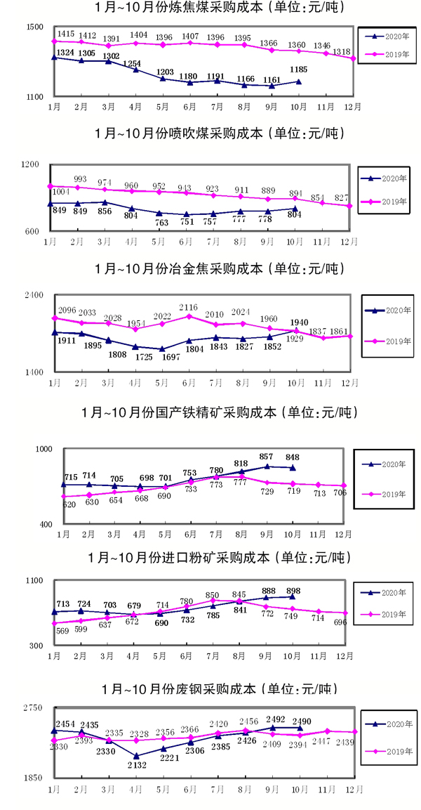 1月~10月份,煉焦煤累計采購成本同比下降11.95%;冶金焦同比下降8.78%;國產鐵精礦同比升高8.61%,進口粉礦同比升高6.34%;廢鋼同比下降0.41%。
