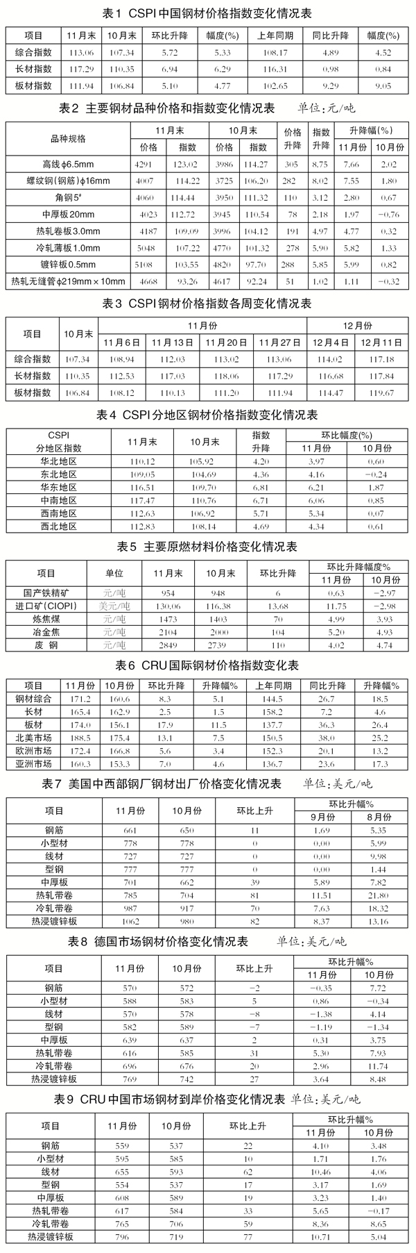 11月份,鋼材價格指數逐周上行。其中,前兩周價格升幅較大,後兩周價格升幅收窄,總體均高於上月水平;進入12月份以來,鋼材價格指數繼續呈上升走勢。(見表3)