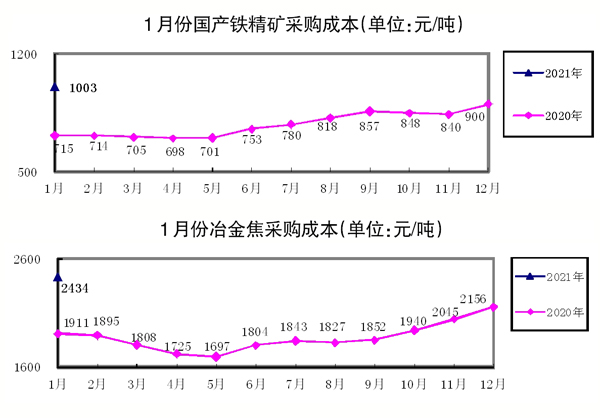 1月份,主要原燃料采購成本環比全麵上升,焦炭和鐵礦石采購成本升幅在10%以上。