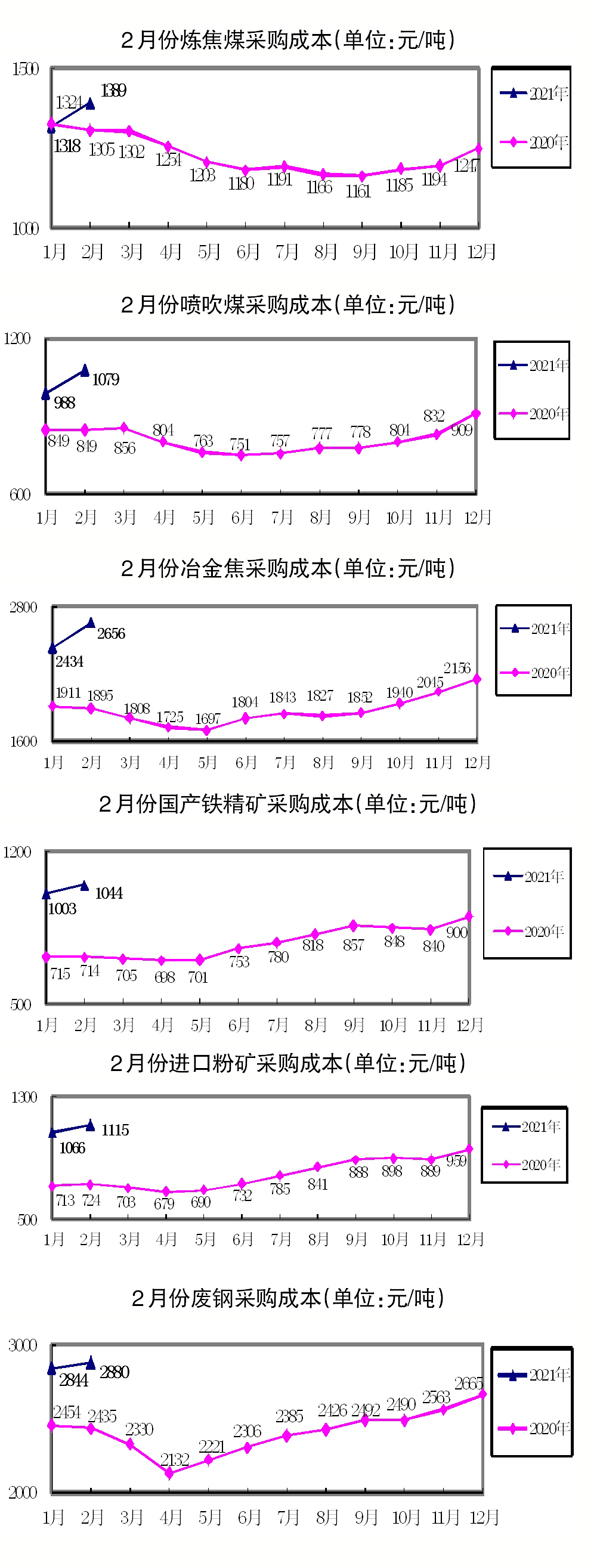2月份,主要原燃料采購成本全麵上升,煤焦產品采購成本升幅均在5%以上。