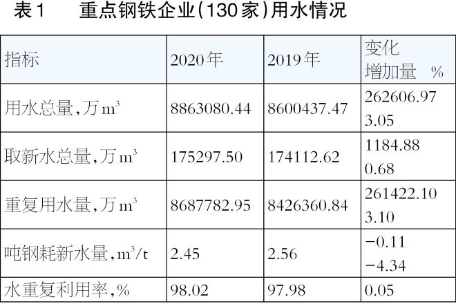表1說明2020年重點鋼鐵企業產品產量提高的幅度均大於用水總量、取新水總量,噸鋼耗新水量下降幅度、企業節水工作取得較好成績。