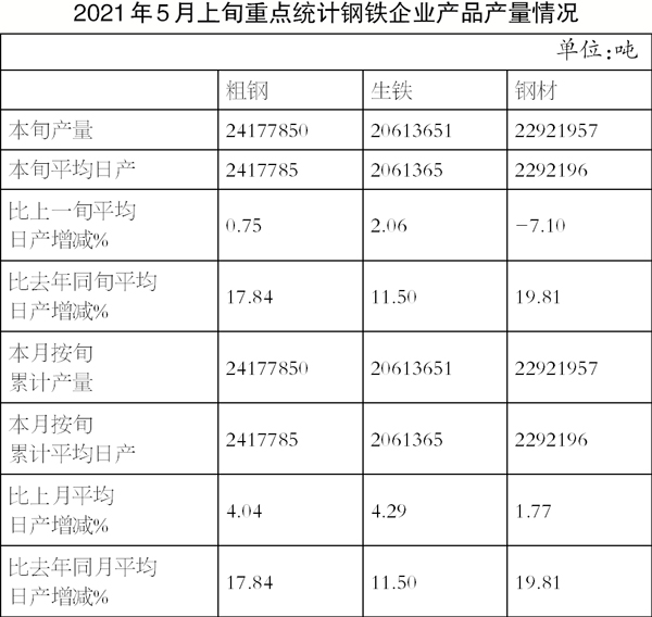 5月上旬,重點統計鋼鐵企業共生產粗鋼2417.79萬噸、生鐵2061.37萬噸、鋼材2292.20萬噸。本旬平均日產粗鋼241.78萬噸,環比增長0.75%、同比增長17.84%;生鐵206.14萬噸,環比增長2.06%、同比增長11.50%;鋼材229.22萬噸,環比下降7.10%、同比增長19.81%。