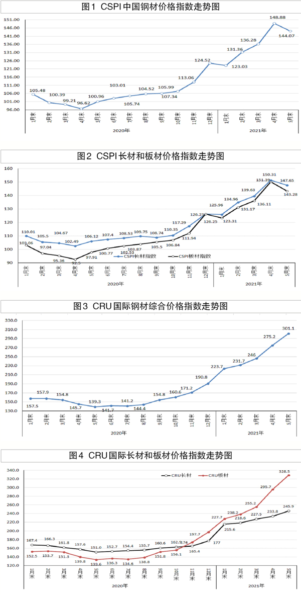 5月份,國際鋼材價格指數(CRU)為301.1點,環比上升25.9點,升幅為9.4%,較4月份收窄2.5個百分點;與去年同期相比上升161.8點,升幅為116.2%,大於國內鋼價升幅73.5個百分點。(見圖3、表6)