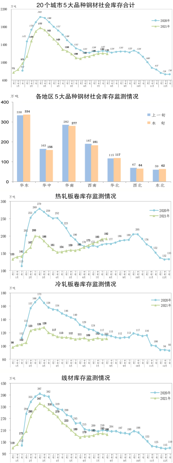 8月上旬,20個城市5大品種鋼材社會庫存1191萬噸,環比減少12萬噸,下降1.0%,庫存有所下降;比年初增加461萬噸,上升 63.2%;比去年同期減少 50 萬噸,下降4.0%。8月上旬,分地區來看,七大區域庫存各有升降。具體情況為:華中環比減少 7 萬噸,下降4.3%,為減量最大地區;西南減少6萬噸,下降3.2%;華南減少5萬噸,下降1.8%;西北減少3萬噸,下降4.5%;華東增加 4萬噸,上升1.2%;東北增加3萬噸,上升5.1%;華北增加2萬噸,上升1.7%。