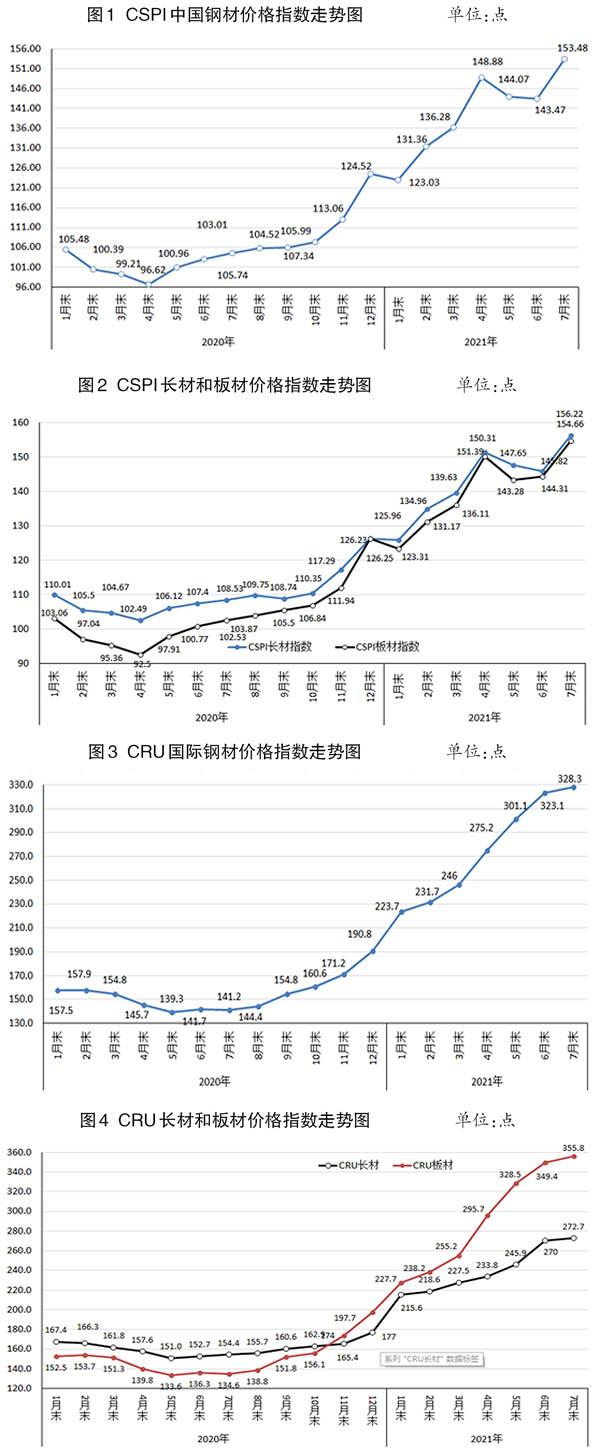 7月份,國際鋼材價格指數(CRU)為328.3點,環比上升5.2點,升幅為1.6%,較6月份收窄5.7個百分點;與去年同期相比上升187.1點,升幅為132.5%。(見圖3、表6)