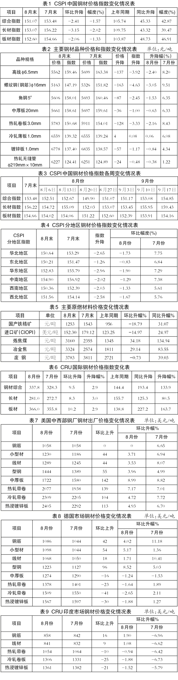 8月份,CSPI鋼材價格指數呈波動下行走勢;進入9月份以來,鋼材價格由降轉升,前三周指數呈小幅上升走勢。(見表3)