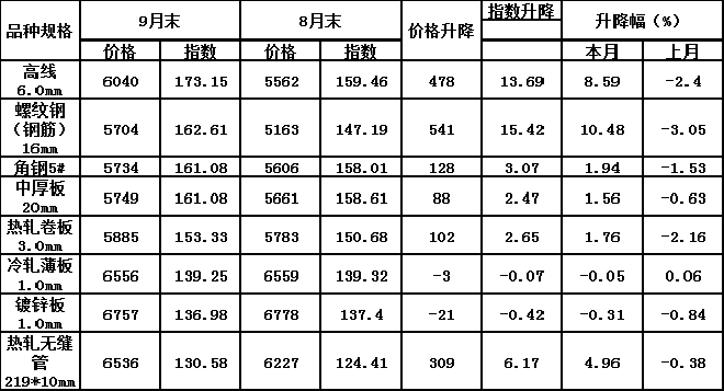 9月份,受“雙控”等環保措施影響,國內鋼鐵產量繼續下降,鋼材市場偏緊預期有所上升,鋼材價格由降轉升。進入10月份以來,鋼材價繼續呈小幅上升走勢。