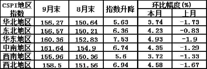 9月份,CSPI全國六大區域指數均由降轉升。其中:華東市場升幅相對較大,環比上升4.93%;西南地區升幅相對較小,環比上升3.72%;華北、東北、中南和西北地區環比升幅分別為3.74%、4.23%、4.35%和4.58%。(見下表)