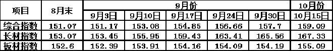 9月末,CSPI長材指數為165.56點,環比上升12.49點,升幅為8.16%;CSPI板材指數為154.19點,環比上升1.59點,升幅為1.04%;長材價格升幅比板材高7.12個百分點。與上年同期相比,長材、板材指數分別上升56.82點和48.69點,升幅分別為52.25%和46.15%。(見下圖、表)