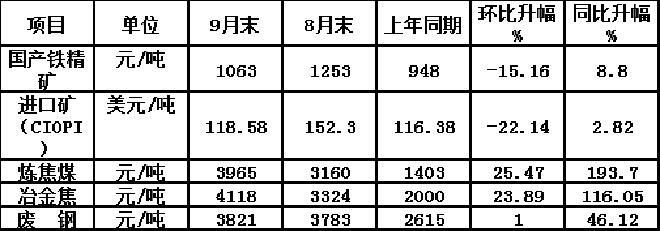 9月份,鐵礦石價格有所回落,但煤焦、廢鋼等原燃料價格環比繼續上升。據鋼鐵協會監測,9月末,國產鐵精礦價格環比下降190元/噸,CIOPI進口礦價格環比下降33.72美元/噸;煉焦煤和冶金焦價格環比分別上升805元/噸和794元/噸,廢鋼價格環比上升38元/噸。從同比情況看,國產鐵精礦和進口礦分別同比上漲8.80%和2.82%,煉焦煤和冶金焦價格分別同比上漲193.70%和116.05%,廢鋼價格同比上漲46.12%。鐵礦石及煤焦、廢鋼價格仍居高位,推升了企業的鋼材成本。(見下表)