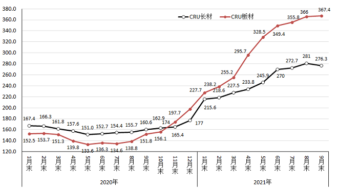 9月份,CRU長材指數為276.3點,環比下降4.7點,降幅為1.7%;CRU板材指數為367.4點,環比上升1.4點,升幅為0.4%;與去年同期相比,CRU長材指數同比上升115.7點,升幅為72.0%;CRU板材指數同比上升215.6點,升幅為142.0%。(見下圖)