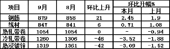9月末,在鋼鐵協會監測的八大鋼材品種中,除冷軋薄板和鍍鋅板價格分別小幅下降3元/噸和21元/噸外,其它品種價格均由降轉升。其中,高線、螺紋鋼、熱軋無縫管回升幅度較大,環比分別上升478元/噸、541元/噸和309元/噸;角鋼、中厚板和熱軋卷板升幅相對較小,環比分別上升128元/噸、88元/噸和102元/噸。(見下表)