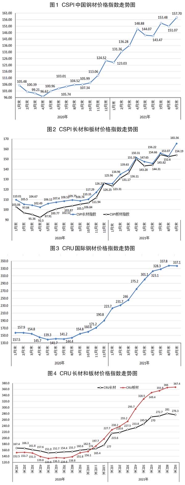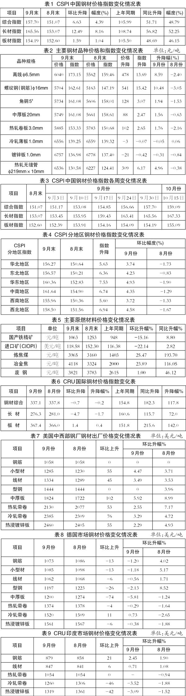 據鋼協監測,9月末,中國鋼材價格指數(CSPI)為157.70點,比8月末上升6.63點,升幅為4.39%,環比由降轉升;同比上升51.71點,升幅為48.79%。(見圖1)